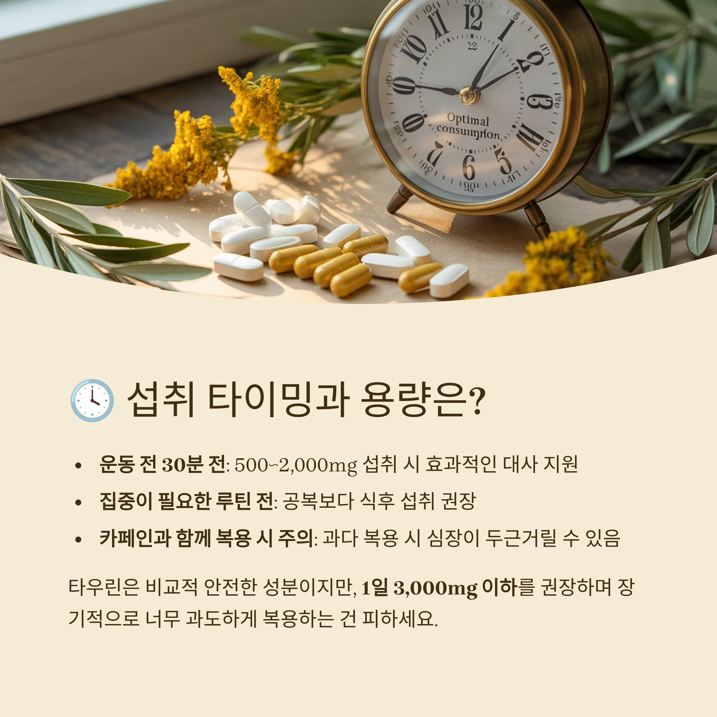 - 운동 전 30분 전: 500~2,000mg 섭취 시 효과적인 대사 지원